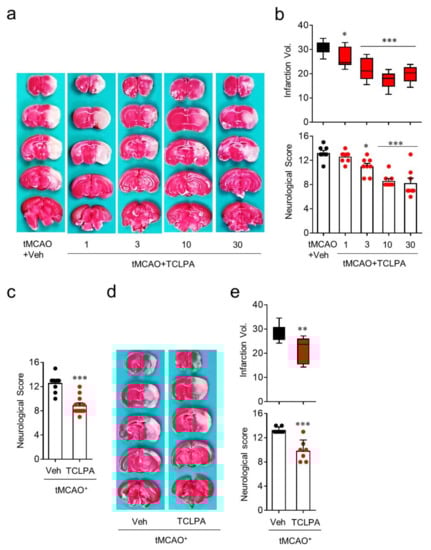 To identify whether LPA5 acts as a pathogenic factor for cerebral ischemia, we used an LPA5 antagonist, TCLPA5. To examine whether suppressing LPA5 activity by TCLPA5 administration would attenuate brain damage, mice were administered either vehicle or different doses of TCLPA5 (1, 3, 10, and 30 mg/kg, i.p.) immediately after reperfusion. Brain infarction was assessed by TTC staining and the neurological score was assessed by modified neurological severity scores (mNSS) at one day after tMCAO challenge. TCLPA5 administration significantly attenuated brain infarction (Figure 2a,b) and improved neurological deficit score (Figure 2b) in a dose-dependent manner in tMCAO-challenged mice compared to vehicle-administered mice. These neuroprotective effects of LPA5 antagonism were most pronounced with 10 mg/kg of TCLPA5, and this dosage was chosen for further in vivo experiments. Next, we determined whether the neuroprotective effects of LPA5 antagonism would persist up to three days after tMCAO challenge. TCLPA5 administration (10 mg/kg, i.p.) immediately after reperfusion significantly improved the neurological deficit score (Figure 2c), even at three days after tMCAO challenge. We further investigated the effects of delayed TCLPA5 administration. Even when TCLPA5 was administered to mice 3 h after reperfusion, brain infarction and the neurological deficit score were significantly attenuated (Figure 2d,e). These in vivo data demonstrate that suppressing LPA5 activity reduces brain damage in mice with ischemic stroke, further suggesting that LPA5 may be a therapeutic target to treat cerebral ischemia.