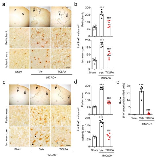 Microglial activation is a well-known pathogenic feature in cerebral ischemia brains []. In the current study, we found that LPA5 upregulation mainly occurred in activated microglia in the post-ischemic brain (Figure 1). Therefore, LPA5 could be involved in microglial activation in the post-ischemic brain. To address this, we determined whether suppressing LPA5 activity through TCLPA5 administration would attenuate microglial activation. Iba1 immunoreactivities and morphological changes were determined to analyze microglial activation in the post-ischemic brain by time (one and three days after tMCAO challenge) and injured regions (the periischemic and the ischemic core regions). The numbers of Iba1-immunopositive cells were increased in both regions at one and three days after tMCAO challenge, and this effect was significantly attenuated by TCLPA5 administration (Figure 4a–d). In addition, it is well-known that ischemic challenge induces clear morphological changes of activated microglia from ramified to amoeboid cells in the ischemic core region at three days after tMCAO challenge [,,]. We also observed a significant increase in amoeboid cells with Iba1 immunoreactivities in the ischemic core region at three days after tMCAO challenge (Figure 4e), which was markedly attenuated by TCLPA5 administration (Figure 4e).