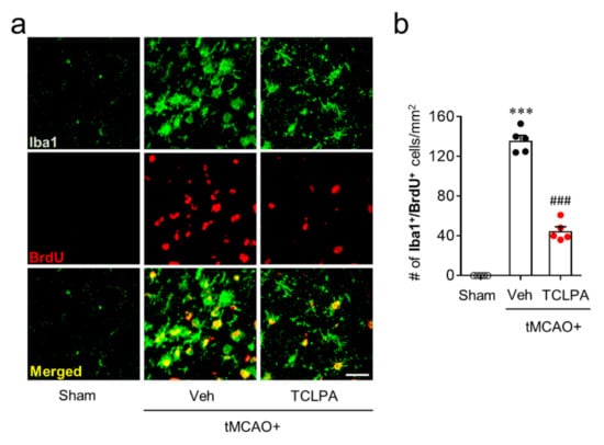 In addition to these features, activated microglia can proliferate in the marginal zone (the penumbra region: the area between the periischemic and the ischemic core regions) of the post-ischemic brain, which is another feature of microglial activation in cerebral ischemia [,]. Therefore, we also determined whether LPA5 could be involved in microglial proliferation in the penumbra region at three days after tMCAO challenge by BrdU/Iba1 double immunofluorescence. In the vehicle-treated group, the number of BrdU/Iba1 double-immunopositive cells was significantly increased in the penumbra region compared with the sham group (Figure 5a,b), demonstrating microglial proliferation. Suppressing LPA5 activity with TCLPA5 administration significantly reduced the number of BrdU/Iba1 double-immunopositive cells (Figure 5a,b), indicating that LPA5 could regulate microglial activation in the post-ischemic brain. Taken together, these data suggested that LPA5 may play a critical role in microglial activation in cerebral ischemia.