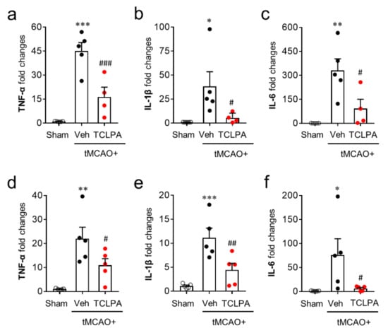LPA5 antagonism attenuates mRNA expression levels of pro-inflammatory cytokines in the injured brain after tMCAO challenge. Mice were challenged with tMCAO. TCLPA5 (TCLPA: 10 mg/kg, i.p.) was administered immediately after reperfusion and mRNA expression levels of pro-inflammatory cytokines (TNF-α, IL-1β, and IL-6) were determined using qRT-PCR analysis at one (a–c) and three days (d–f) after tMCAO challenge. n = 4 ~ 5 mice per group. * p < 0.05, ** p < 0.01, and *** p < 0.001 versus sham; # p < 0.05, ## p < 0.01, and ### p < 0.001 versus vehicle-administered tMCAO group.