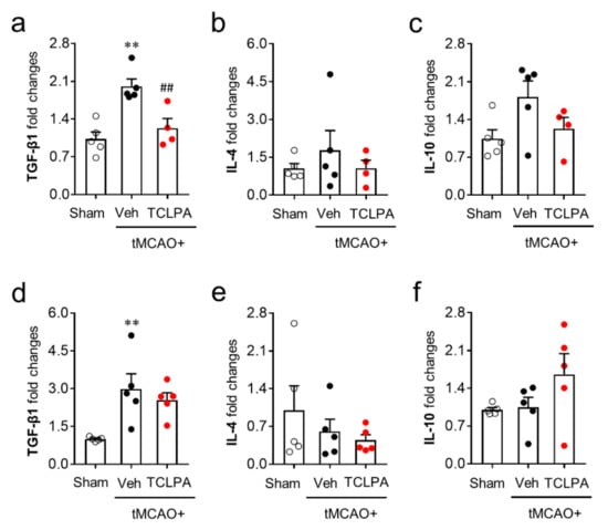 LPA5 antagonism does not increase mRNA expression levels of anti-inflammatory cytokines in the injured brain after tMCAO challenge. Mice were challenged with tMCAO. TCLPA5 (TCLPA: 10 mg/kg, i.p.) was administered immediately after reperfusion, and mRNA expression levels of anti-inflammatory cytokines (TGF-β1, IL-4, and IL-10) were determined by qRT-PCR analysis at one (a–c) and three days (d–f) after tMCAO challenge. n = 4 ~ 5 mice per group. ** p < 0.01 versus sham; ## p < 0.01 versus vehicle-administered tMCAO group.