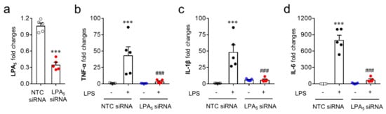 LPA5 knockdown attenuates mRNA expression levels of pro-inflammatory cytokines in LPS-stimulated BV2 microglia. Transfected BV2 microglia with non-target control (NTC siRNA) or LPA5 siRNA were stimulated with LPS (100 ng/mL) for 24 h and mRNA expression levels of LPA5 or pro-inflammatory cytokines (TNF-α, IL-1β, and IL-6) were then determined by qRT-PCR analysis. (a) Knockdown efficiency for LPA5. n = 5 per group. *** p < 0.001 versus cells transfected with non-target control siRNA (NTC siRNA). (b–d) Effects of LPA5 knockdown on mRNA expression levels of TNF-α (b), IL-1β (c), and IL-6 (d). n = 5 per group. *** p < 0.001 versus vehicle-treated cells with NTC siRNA; ### p < 0.001 versus LPS-treated cells with NTC siRNA.