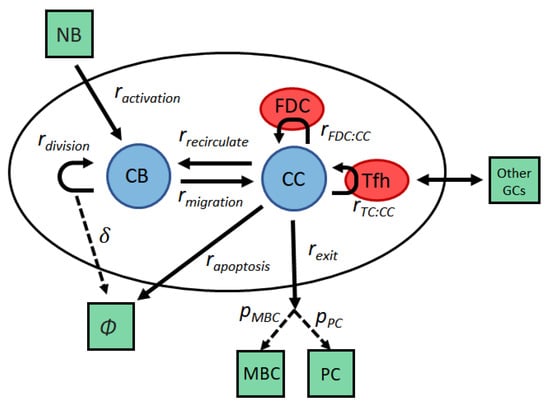 GCs are histologically divided into two different compartments, the dark zone (DZ) and light zone (LZ), which play distinct and important roles in the maturation and selection of B cells []. The DZ consists primarily of a tight cluster of highly proliferative B cells, known as centroblasts (CBs), while the LZ is less compact and more diverse, including GC B cells, known as centrocytes (CCs), antigen-presenting follicular dendritic cells (FDCs) and a smaller population of T follicular helper cells (T). A GC reaction is initiated when naive B cells are activated by T. Upon activation, naive B cells initiate a phase of monoclonal expansion characterized by very rapid proliferation rates and somatic hypermutation (SHM) of their immunoglobulin genes [,]. After a few days, GCs become polarized into the DZ and LZ, and CBs migrate to the LZ, where they undergo a phase of selection. CCs in the light zone are committed to apoptosis and compete for survival signals delivered by T. To receive such signals, CCs must first acquire antigen from FDCs. Higher affinity CCs can capture larger amounts of antigen, which is then engulfed, digested into peptides and returned to the B-cell surface bound to the major histocompatibility MHC class II. T that bind with enough strength to the peptide–MHC complex (pMHC) deliver signals that stop apoptosis, upon which a CC can leave the GC and terminally differentiate into a plasma cell (PC), responsible for secreting antibodies, or into a long-lived memory B cell (MBC) that keeps memory of past infections and can rapidly respond to repeated antigen exposure. Low affinity cells that do not receive enough T signaling are eliminated by apoptosis in a process that replicates Darwinian evolution at the cellular level.