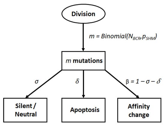 Decision tree to model cell fate after somatic hypermutation (SHM). The number of mutations in the BCR after each centroblast division is sampled from a binomial distribution. Each mutation can produce a BCR of similar affinity, lead to cell apoptosis or produce a BCR of different affinity with probability , , and respectively.