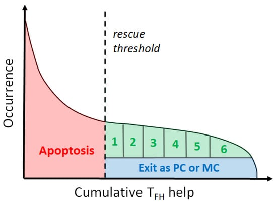 Upon exit from the GC, B cells terminally differentiate into PCs or MBCs. Temporal data has demonstrated the existence of a temporal switch, where MBCs tend to be produced during the early phases and PCs are produced at later times of the response []. The precise mechanism that determines whether a cell differentiates into a PC or MBC is not completely understood [], although recent work suggests that affinity to antigen plays a central role in selecting the cells that enter the PC pool, while lower affinity selected B cells progress to MBCs []. In this scenario, T help stimulates CD40 signaling and IRF4 transcription, which in turn regulates, in a dose-dependent manner, the choice between differentiating into a PC or cycling back into the DZ []. This model has been computationally investigated using a multi-scale probabilistic model and shown to lead to good agreement with the experimentally determined GC output []. Regarding the differentiation into MBCs, the determinants that predispose cells to enter the MBC pool or the markers that identify cells committed to the MBC lineage are not known. A fraction of LZ B cells with lower affinity are prone to progress to resting MBCs in a Bach2 TF-dependent manner [,], although high-affinity cells might also become MBCs. This suggests that stochastic effects might be at play in the selection of the MBC fate.