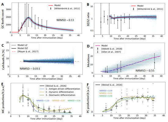 Figure 4. Experimental data vs. our model after 1000 simulations, along with the obtained normalized root mean square deviation (NRMSE) of each measured GC property. Thin blue lines represent one single Gillespie simulation, while thick lines are the average over all simulations. Experimental results are represented by a tick bar corresponding to the median and 1st-3rd quartiles, the central point being the median. Figures (A,B) depict simulations and experimental data about cell count and DZ/LZ volumetric ratio respectively, the latter derived from []. Figure (C) shows the death rate percentages of B cells in both the DZ and LZ (8%/h) []. Figure (D) shows the mutation rates at different time points, and roughly corresponds to 5 mutations every 10 days [,]. Figures (E,F) illustrate the temporal switch from memory B cell to plasma cell production simulated with our model using 3 different differentiation scenarios and experimentally measured []. - Cell death: Apoptosis is prevalent in the GC, with up to half of all GC B cells dying every 6 h []. We use a relatively constant cell death rate of 8%/h in both the DZ and LZ through the entire GC response.