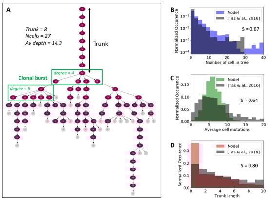 To construct trees from experimental data, i.e., repertoire sequencing data, we first align the variable (V), diversity (D) and joining (J) gene segments of each sequence using the IMGT [] (for V,D,J) and VBASE2 (for V) [] databases with BLAST []. In the case of discrepancy between V segment assignments from the two databases, the assignment leading to the lowest number of somatic mutations is chosen. As cells have at most 20 mutations, all assignments were unambiguous with a V(D)J alignment score over 95%. Next, functional V(D)J sequences are grouped together into clones if they shared the same V, J and D gene segments. The grouped sequences from each clone are then aligned with ClustalW []. This second alignment is necessary to infer a mutation matrix, as tree inference algorithms typically require sequences to be aligned and of the same length, while experimentally determined sequences have different lengths, and include insertions and deletions. The corresponding trees are computed with SCITE [], a stochastic search algorithm based on Markov chain Monte Carlo sampling. The root node is defined by taking the unmutated V(D)J germline and filling the remaining junction region with the consensus sequence of all available sequences. Finally, the obtained trees are analyzed with the BioPhylo Python library [] to compute the main topological tree properties, such as number of leaves, internal nodes, branches, trunk, etc.