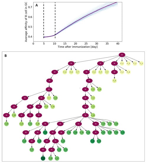 - Shahaf, G.; Barak, M.; Zuckerman, N.S.; Swerdlin, N.; Gorfine, M.; Mehr, R. Antigen-driven selection in germinal centers as reflected by the shape characteristics of immunoglobulin gene lineage trees: A large-scale simulation study. J. Theor. Biol. 2008, 255, 210–222. [Google Scholar] [CrossRef]