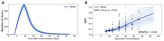 Regarding PC/MBC differentiation, the time-dependent GC output of the three models investigated in Section 2.7 reproduces the temporal switch experimentally observed (Figure 4E,F), where memory cell models are produced during the first two weeks of the GC reaction, and plasma cells are produced afterwards []. The model based on a fixed threshold has the lowest agreement with experiments, as this model does not lead to a substantial production of MBCs after 2 weeks, while MBCs are produced during the whole GC reaction, albeit at a moderate rate at late time-points. On the other hand, both the dynamic threshold and stochastic differentiation model are compatible with experimental data (average NRMSD = 0.52 and 0.59), with the stochastic model fitting the data slightly better.