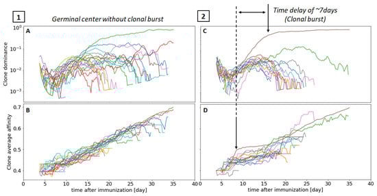 We also generated BCR sequences from our simulations and compare the simulated sequences with single-cell BCR sequencing data from individual GCs by means of phylogenetic trees. Each tree represents the evolutionary process that took place in the GC and the acquisition of new mutations that conferred higher affinity to the most fitting clones. The comparison of important tree topological properties, such as the number of leaves, the average depth, or the length of the trunk, reveals good agreement between our model and experiments. We find our predicted distribution of mutations per cell to be narrower than experimentally characterized (Figure 5), which could indicate that our current model of affinity, where one mutation can only increment the affinity by , constrains the density function of the mutations count to be narrower. Furthermore, because of our explicit modelling of the BCR sequences, our model enables the investigation of the clonal diversity within the GC and the emergence of dominance. A first observation is that B cells with the same affinity can have very different outcomes, resulting in a high variability of the evolution of clonal diversity across simulations, which matches experimental observations [] (Figure 7). Interestingly, a deeper investigation of the emergence of clonal dominance demonstrates that small advantages in the affinity to antigen acquired through random mutations are amplified and result in clonal dominance within a week (Figure 8 and Figure 9). This delayed correlation might explain why previous computational models found limited correlation between clone abundance and affinity throughout the GC lifespan [].