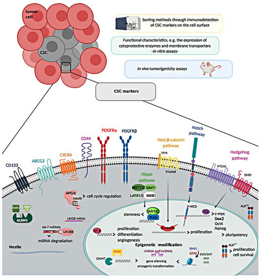 From a molecular perspective, CSCs are considerably different from the other tumor cells. In the 1990s, CSCs were identified for the first time in leukemia as CD34+ and CD38- cells with high proliferative rate and tumor-forming capacities in vivo [11]. Generally, CSCs share some common markers with normal stem cells, but stem cell markers in CSCs appear to be upregulated, or mutations have been described [12]. Also, common stem-cell-associated pathways have been shown to be aberrantly expressed in CSCs [13]. Thereby, the pathways that regulate the balance between self-renewal and differentiation in normal stem cells are rather uncontrolled in CSCs, leading to tumorigenesis.