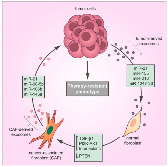 Exosomes secreted by cancer cells transfer miRNAs to fibroblasts in the tumor microenvironment that induce the cancer-associated fibroblast (CAF) differentiation, thereby exosomal miRNAs derived from CAFs confer drug resistance in cancer cells by inducing metastasis and proliferation and inhibiting the antitumor effects of cytotoxic drugs, such as apoptosis and cell cycle arrest.