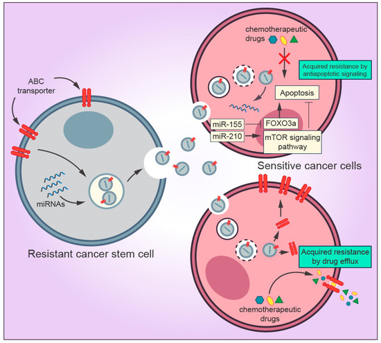 Mechanisms by which exosomes derived from cancer stem cells (CSCs) regulate drug resistance in the tumor microenvironment. Exosomal miRNAs secreted by CSCs are transferred to sensitive cancer cells and inhibit the pro-apoptotic property of FOXO3a and activates the mTOR signaling pathway, which is directly associated with inhibition of apoptosis and tumor progression, thereby blocking the drug-induced apoptosis. Exosomes can promote drug resistance to sensitive cells by transferring ABC transporters (drug efflux pumps) that actively export drugs out of the cell.