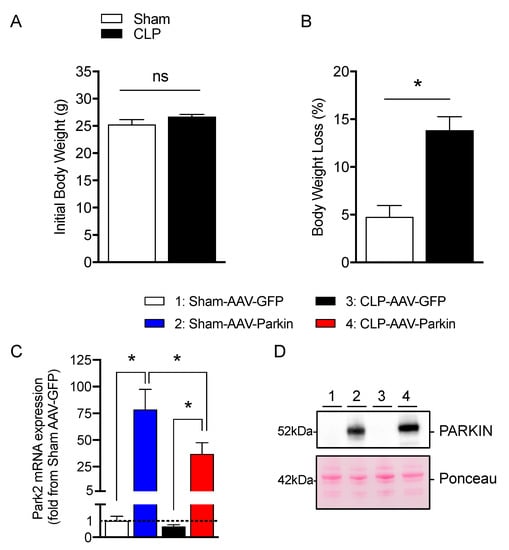 Four weeks after the intramuscular injections of AAVs, mice were subjected to cecal ligation and perforation (CLP) to induced polymicrobial sepsis. Sham-operated mice were used as control. At baseline (prior to sham and CLP procedures), body weight values were similar in the sham and CLP groups, as shown in Figure 1A. Body weight loss was more pronounced in the CLP group relative to the sham group (−13.8 ± 1.4% vs. −4.7±1.1%, respectively, p < 0.05), as shown in Figure 1B. As shown in Figure 1C,D, the intramuscular injection of AAV-Parkin significantly increased Park2 mRNA expression and Parkin protein content, in the skeletal muscles of both Sham-operated and CLP mice. These results demonstrate that our approach was successful in overexpressing Parkin in mouse skeletal muscle.