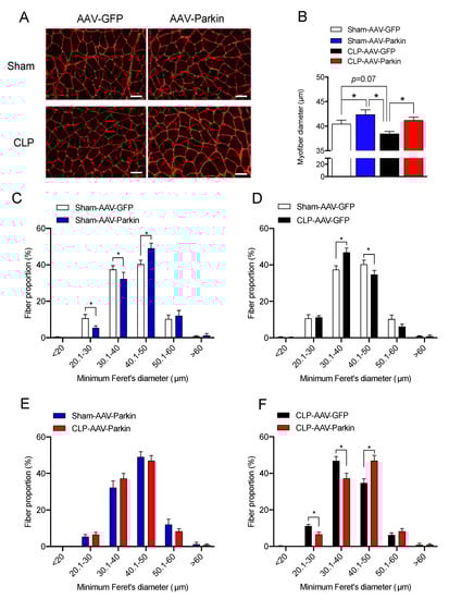 Muscles samples were mounted on plastic blocks in tragacanth gum and frozen in liquid isopentane cooled in liquid nitrogen. The samples were then stored until use at −80 °C. The samples were cut into 10 µm cross-sections using a cryostat (Leica Biosystem Inc., Concord, ON, Canada) at −20 °C and then mounted on lysine coated slides (Superfrost) to assess muscle fiber size, as described in [,]. To this end, the muscle cross-sections were first allowed to reach room temperature and were rehydrated with phosphate buffered saline (PBS, pH 7.2) and then blocked with goat serum (10% in PBS). The sections were then incubated with primary rabbit IgG polyclonal anti-laminin antibody (MilliporeSigma, Oakville, ON, Canada, L9393, 1:750) for 1 h at room temperature. The sections were then washed three times in PBS before being incubated for 1 h at room temperature with an Alexa Fluor 594 goat anti-rabbit IgG antibody (Invitrogen, Burlington, ON, Canada A-11037, 1:500). The sections were then washed three times in PBS and the slides were cover-slipped using Prolong Gold (Invitrogen, P36930) as mounting medium. The slides were imaged with a Zeiss Axio Imager 2 fluorescence microscope (Zeiss, Dorval, QC, Canada). The median minimum Feret’s diameter of the muscle fibers, a reliable marker of myofiber size [], was determined for each muscle sample using at least 200 fibers per muscle sample (average number ± SD of fiber analyzed for each group: sham AAV-GFP, 317 ± 62; sham AAV-Parkin, 300 ± 15; CLP AAV-GFP, 345 ± 30; CLP AAV-Parkin, 304 ± 46). Analyses were performed using ImageJ (NIH, Bethesda, MD, USA, https://imagej.nih.gov/ij/).