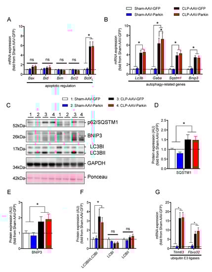 We then investigated whether Parkin overexpression and sepsis affect the expression levels of apoptotic and autophagy-related genes. Neither Parkin overexpression nor sepsis affected the mRNA levels of pro-apoptotic Bax, Bid, Bim, and anti-apoptotic Bcl2, depicted in Figure 3A. As shown in Figure 3A, the expression level of BclXL was higher in septic animals. qPCR analyses revealed a significant increase in the mRNA levels of Lc3b, Sqstm1, Gabarapl and Bnip3 in septic mice, shown in Figure 3B. The expression of Gabarapl was significantly higher in the Parkin overexpressing muscles of septic animals. No other impacts of Parkin overexpression on apoptotic and autophagy-related genes were observed. In line with our gene expression data, the protein contents of SQSTM1 (also known as p62) and BNIP3, two proteins regulating autophagy and mitophagy, were increased in septic animals, as shown in Figure 3C–E. The ratio of LC3-II to LC3-I was significantly increased in septic mice, suggesting an induction of autophagy, shown in Figure 3F. No impact of Parkin overexpression on the content of SQSTM1 and BNIP3 and the LC3-II to LC3-I ratio could be evidenced. We then assessed the expression levels of two key E3 ligases known to contribute to skeletal muscle atrophy [,], Fbxo32 (Atrogin-1) and Trim63 (MuRF1). The expression of these two E3 ligases was significantly increased in the skeletal muscle of septic animals, shown in Figure 3G. Parkin overexpression did not impact Fbxo32 and Trim63 expression. It is worth mentioning that neither Parkin overexpression nor sepsis had an impact on the content or phosphorylation levels of AKT and 4EBP1, two key proteins involved in the regulation of protein synthesis, as shown in Supplementary Figure S2. Taken altogether, these data indicate that Parkin overexpression did not attenuate sepsis-induced increases in catabolic signaling.