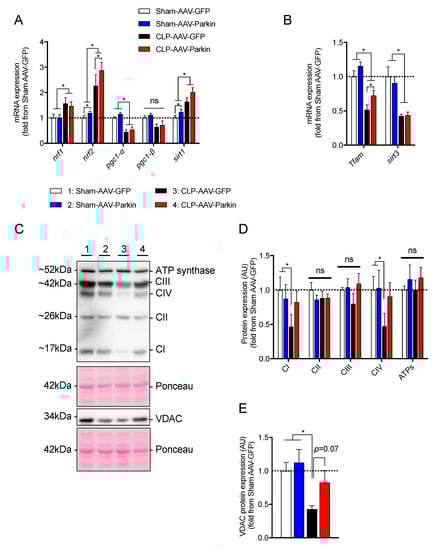 The impact of Parkin overexpression and sepsis in skeletal muscle on genes regulating mitochondrial biogenesis and on mitochondrial protein contents. (A,B) qPCR analysis of genes involved in mitochondrial biology. (C) Representative immunoblots performed with primary antibodies against representative subunits of the OXPHOS complexes and VDAC. Ponceau stains were used as loading controls. (D,E) Quantification of the contents of (D) representative subunits of the OXPHOS complexes and (E) VDAC. 1 = Sham-AAV-GFP; 2 = Sham-AAV-Parkin; 3 = CLP-AAV-GFP; 4 = CLP-AAV-Parkin. Data are presented as mean ± SEM. (n = 6–9/group, * = statistically significant; ns = not statistically significant).