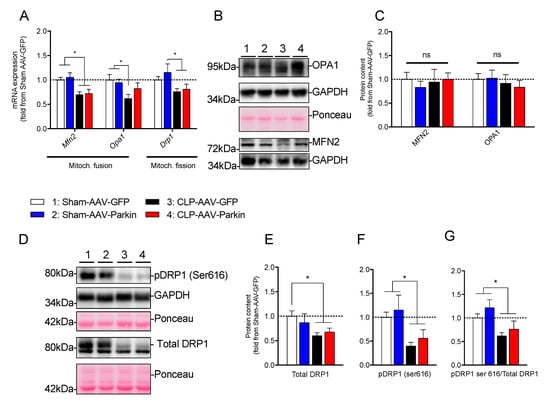 To gain better insights into the mechanisms underlying the impact of sepsis and Parkin overexpression on mitochondrial morphology, we next assessed the expression and content of major genes and proteins regulating mitochondrial dynamics. In the Sham-operated mice, Parkin overexpression had no impact on the mRNA expression and protein levels of Mfn2, Opa1 and Drp1, as shown in Figure 6A–G. As shown in Figure 6A, sepsis in GFP expressing muscles resulted in a decrease in the mRNA levels of pro-fusion Mfn2 and Opa1 and pro-fission Drp1. In Parkin overexpressing muscles, CLP resulted in a significant decrease in the mRNA levels of Mfn2 and Drp1, while Opa1 expression remained unaffected, shown in Figure 6A. At the protein level, no impact of sepsis or Parkin overexpression could be evidenced on MFN2 and OPA1 protein content. Interestingly, DRP1 protein levels were lower in the GFP and Parkin expressing muscles of CLP mice, relative to the sham group, as shown in Figure 6D,E. Similarly, DRP1 phosphorylation on Ser616, an activation site which triggers DRP1 translocation from the cytoplasm to mitochondria to promote mitochondrial fission [], was also decreased in the GFP and Parkin expressing muscles of the CLP group, relative to the sham group, as shown in Figure 6D–G. These results indicate that sepsis seems to result in an inhibition of mitochondrial fission and that this effect was not influenced by Parkin overexpression.