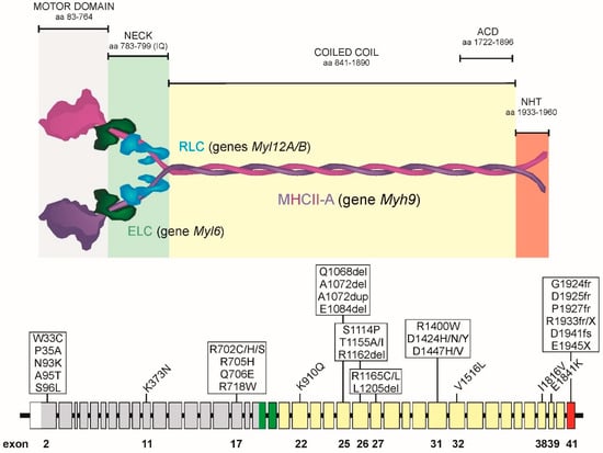 Deletion of the MYH9 gene has catastrophic consequences during development. Somatic deletion of the MYH9 gene in mice impairs embryo development due to acute defects in the formation of the visceral endoderm [91]. This is due to impaired cell–cell adhesion, which is also observed in epithelial cell cultures in which MHCII-A is deleted [92]. None of mutations described in MYH9-RD patients cause a complete lack of NMII-A [3]. Instead, they generate a spectrum of defective NMII-A variants, including: (i) motor deficient variants, e.g., R702C/H/S; (ii) mutants with altered dimerization, which include variants displaying mutations that affect the coiled coil region (aa 841–1890); (iii) variants with altered oligomerization, that is, those bearing mutations affecting exons 40–41, which encode the end of the coiled coil domain and the non-helical tailpiece.
