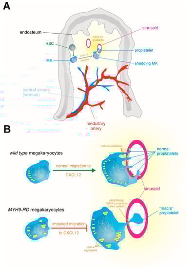 (A) Scheme depicting the generation and migration of megakaryocytes (MK) in the bone marrow. MK differentiate from HSC in the endosteum and then migrate towards the sinusoids driven by CXCL12 gradients. There, they insert protrusions in the gaps between endothelial cells lining the sinusoids. The protrusions become proplatelets. (B) Comparison between wild-type and MYH9-KD MKs. Ploidy (represented as white dotted ellipses) is normal in both cases, but MYH9-RD MKs migrate deficiently towards sinusoids, which depends on CXCL12 [32]. The combination of the shear stress driven by blood flow in the sinusoid and NMII-A-driven constriction excises the proplatelets (as explained in Section 3). The molecular reason for the onset of macrothrombocytopenia in MYH9RD patients has not been formally explained (see Section 7). The figure also integrates the known role of NMII-A to push the nucleus in three dimensions, represented by yellow arrows behind the multinucleated core. This has not been shown explicitly for MKs, but it has for other cells of hematopoietic origin, such as dendritic cells [33,34]. Yellow squares represent NMII-A aggregates in MYH9-KD MKs.