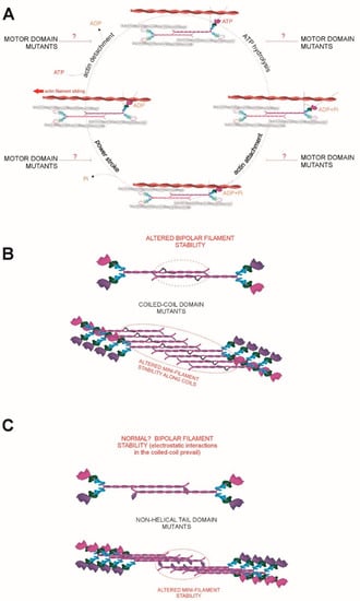 (A) Schematic representation of the cross-swinging cycle [93], and the possible effects of diverse motor mutants found in MYH9-RD patients. The mutations can affect ATP hydrolysis (top right), actin binding (bottom right), phosphate release (bottom left) and/or nucleotide exchange and/or actin detachment (top left). (B) Possible effects of mutations in the coiled coil domain (represented as a bulge in the center of the coil). Depending on the precise site and type of mutation, the formation of the initial bipolar mini-filament (top) may be impaired, or enhanced. The same argument applies to their growth into mini-filaments (bottom). (C) Possible effects of mutations in the NHT domain (represented as a bulked-up tail). It is unlikely that bipolar filament formation (top) is largely affected as electrostatic interactions between coiled coils dominate this step [73,74]. Color codes of the different chains is as in Figure 1.