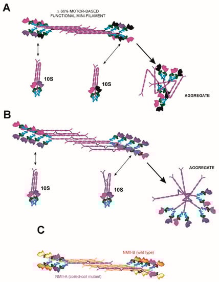 (A) Schematic representation of a mixed mini-filament including wild-type (magenta/purple) and a generic motor mutant (black) NMII-A. Functionality (≥ 66%) is calculated for the specific composition of the mini-filament (eight wild-type heads and four mutants). In this particular filament, functionality would be 66.6% if the mutant had 0% activity, as discussed in Section 6.1. Bottom left represents the exchange of wild-type NMII-A. Bottom right represents the folded conformation into three segments and the possibility that the mutant folds back into 10S normally, or does not fold back into 10S, aggregating in an aberrant conformation instead. (B) Schematic representation of a mixed mini-filament including wild-type (magenta/purple) and a generic coiled coil mutant (bulge in the coiled coil) NMII-A. Bottom left represents the exchange of wild-type NMII-A. Bottom right represents the possibility that the coiled coil mutant folds back into 10S, or cannot fold back into 10S, aggregating in an aberrant conformation instead. (C) Cartoon depicts the integration of NMII-A, wild-type (magenta/purple) or mutant (black) into mini-filaments with other NMII paralogs, e.g., NMII-B (in orange/red tones), which is thermodynamically feasible, as shown in [74]. Color codes of the different chains is as in Figure 1.