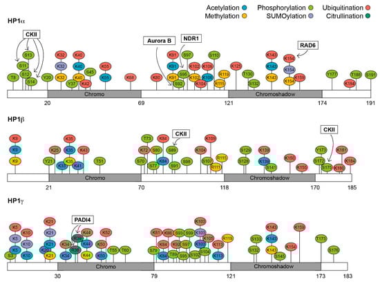 HP1 isoforms can be modified at several residues: 35 modification sites have been detected for HP1α, 34 for HP1β, and 37 for HP1γ (Figure 1). These modifications include phosphorylation, acetylation, methylation, formylation, ubiquitination, SUMOylation and citrullination [43,44,45]. We will discuss how each of these modifications can change HP1 function.