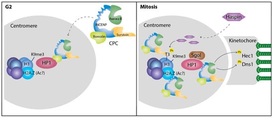 HP1α was also identified as one of the first known binding partners of the chromosomal passenger complex (CPC) [21], a crucial regulator of mitosis composed of the kinase protein Aurora B, the scaffold subunit inner centromere protein (INCENP) and two regulatory proteins Survivin and Borealin. The chromoshadow domain of HP1α has been shown to interact with INCENP and Borealin through a conserved chromoshadow domain-binding motif (PXVXL) present in both CPC subunits [21,22]. As these interactions require HP1α binding to the same motif in both proteins, they cannot occur at the same time. In fact, they appear to be time-regulated and have different functions: while the interaction with Borealin before mitotic entry is required for CPC recruitment and activation at the centromeres [22,81], HP1α–INCENP interaction during mitosis is important for HP1α localization at the centromere and proper chromosome segregation [82,83]. Disruption of the INCENP sequence responsible for HP1α binding affects chromosome segregation and sister-chromatids cohesion, a phenotype that can be rescued by tethering HP1α to the centromere [83]. HP1α–INCENP interaction increases centromeric localization of Haspin, which protects sister-chromatids cohesion [83,84]. A negative feedback loop might exist, as Haspin phosphorylates H3T3, which is important for CPC accumulation at mitotic centromeres [85,86,87,88,89].