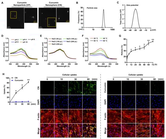 Characterization of curcumin nanosphere (CN). (A) Field emission scanning electron microscope (FE-SEM) analysis of curcumin nanoparticle (CP) and CN. The white and yellow scale bars indicate 500 nm and 250 nm, respectively n = 3. (B) Particle size analysis of CN by using dynamic light scattering method. n = 3. (C) Zeta potential analysis of CN. n = 3. (D) UV-Vis absorption spectra showing the effect of varying pH (2, 4, 6, 8 and 10) on the stability of CN. n = 3. (E) UV-Vis absorption spectra showing the effect of different volume (50–250 µL) of 0.1 M NaCl on the stability of CN. n = 3. (F) UV-Vis spectra showing the effect of temperature (20, 40, 60 and 80 °C) on the stability of CN. n = 3. (G) In vitro kinetic release of curcumin from CN in PBS (pH 7.4) at 37 °C. n = 3. Data represent means ± S.E. n = 3. * p ≤ 0.05 versus 0 h. ** p ≤ 0.01 versus 0 h. (H) The cellular uptake of the CN and curcumin for 1 h was quantified (left panel) and visualized by staining the CN and curcumin with 2-aminoethyl diphenyl borate (DPBA) (right panel). Data represent means ± S.E. n = 3. * p ≤ 0.01 versus 0 min. ** p ≤ 0.05 versus 0 min. Green fluorescence represents the cellular uptake of CN and curcumin labeled with DPBA. 4′,6-diamidino-2-phenylindole (DAPI) was used for nuclear counterstaining (Blue). Scale bars represent 100 μm (magnification, × 400).