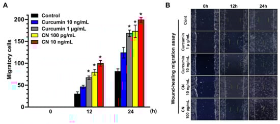 The clinical application of curcumin has been restricted due to its poor aqueous solubility, permeability and bioavailability. To evaluate the role of CN loaded with curcumin in the regulation of stem cell motility, UCB-MSCs were exposed to various concentrations of CN and curcumin for 24 h. A significant increase in the cell migration was observed starting at 12 h after incubation with 100 pg/mL of CN (Figure 2A). On the other hand, the migration-promoting effect of curcumin was observed starting at an amount of 1 µg/mL. These results indicate that CN has greater promotive efficacy by 10,000-fold on the cell motility than curcumin. The same results were visually confirmed with a microscope (Figure 2B).