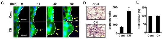 Human umbilical cord blood-derived mesenchymal stem cells (UCB-MSCs), self-renewing multipotent progenitors, are among the most abundant sources of non-embryonic stem cells [18] and have the capacity to differentiate into multiple cell types with low immunogenicity. They are also free of any ethical controversy [18,19,20]. Thus, human UCB-MSCs can be regarded as the most potential stem cell source, and their use has led to major advances in cell therapy and regeneration strategies in the areas of bone regeneration and spinal cord injuries [21,22]. Given the migration ability of MSCs via circulation to tissue damage sites, many studies have also focused on the development of new molecules which regulate MSC migration during the wound healing, damage repair, and regeneration process [23,24,25,26]. Thus, in this study, we investigated the functional role of CN in promoting the migratory behavior of UCB-MSCs during the wound healing process.