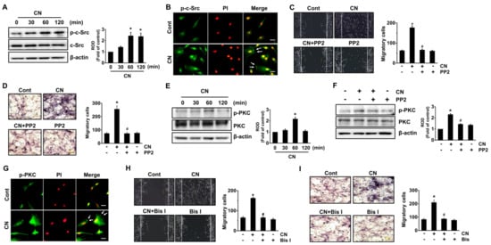 To know how CN regulates the stem cell motility, we next evaluated the activation of c-Src tyrosine kinase and protein kinase C (PKC), which are responsible for the cell movement [34,35]. CN (100 pg/mL) significantly induced the phosphorylation of c-Src between 60 and 120 min (Figure 3A). The increased membrane accumulation of p-c-Src in the cell treated with CN was further confirmed by immunofluorescence staining and counter-labeling with propidium iodide (PI) (Figure 3B). Interestingly, a pre-treatment with the c-Src inhibitor, PP2, inhibited the cell migration as induced by CN (Figure 3C). The effect of CN via c-Src in promoting the cell motility was further confirmed by transwell migration assay (Figure 3D). CN significantly induced the phosphorylation of PKC (Figure 3E), though the increase at 60 min could be blocked by c-Src inhibitor (Figure 3F). In addition, translocation of p-PKC from the cytosol to the membrane compartment was observed after cells were treated with CN at 60 min as assessed by immunofluorescence staining (Figure 3G). Importantly, cell migration was abrogated by blockage of PKC with PKC inhibitor, Bisindolylmaleimide I (Bis I), in the cells treated with CN (Figure 3H). The migration-promoting effect of CN via PKC was further assessed by transwell migration assay (Figure 3I). These results indicate that CN regulates the stem cell motility by activation of c-Src and PKC.