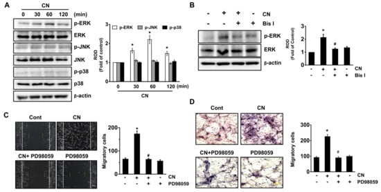 CN uniquely regulates the ERK pathway responsible for the cell migration. (A) Time responses of phosphorylation of mitogen-activated protein kinases (MAPK) in cells exposed to CN for 120 min are shown. Data represent the means ± S.E. n = 3. * p ≤ 0.01 vs. 0 min. (B) Cells were pretreated with Bis I for 30 min prior exposure to CN for 60 min. The level of phosphorylation of MAPK was determined by western blot. Data represent the means ± S.E. n = 4. * p ≤ 0.01 vs. control. # p ≤ 0.05 vs. CN alone. (C) Cells were pretreated with ERK inhibitor, PD98059 (10 µM) for 30 min prior exposure to CN for 24 h. Cell migration was determined by wound-healing migration assay (left panel) and quantified (right panel). Scale bar represents 100 µm (magnification, × 100). n = 3. * p ≤ 0.01 vs. control. # p ≤ 0.001 vs. CN alone. (D) The migration capacity of UCB-MSCs treated with CN for 24 h was assessed in transwell permeable support with 8.0 μm pore size membrane coated with Matrigel. Data represent the means ± S.E. n = 3. Scale bars represent 100 μm (magnification, × 200). * p ≤ 0.001 vs. control. # p ≤ 0.01 vs. CN alone. (A,B) ROD is the abbreviation for relative optical density.