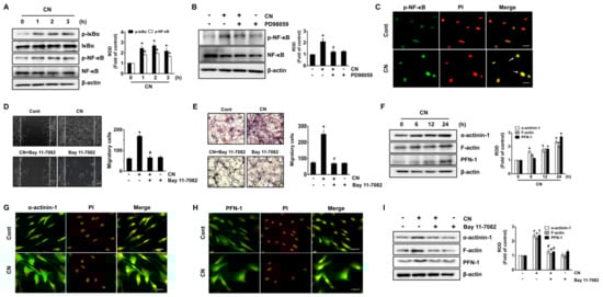 We further examined the role of CN in activation of nuclear factor-kappa B (NF-κB), an important transcription factor related to the genes expression of cytoskeletal reorganization [36]. CN significantly induced the phosphorylation of NF-κB inhibitor (IκBα) and NF-κB from 1 to 3 h (Figure 5A), though the increase at 2 h could be blocked by ERK inhibitor (Figure 5B). The increased level of p-NF-κB induced by CN was also confirmed by the immunofluorescence method (Figure 5C). Interestingly, the cell motility triggered by CN was significantly inhibited by a treatment with the NF-κB inhibitor, Bay 11-7082 (Figure 5D,E). These results demonstrate the ERK-mediated NF-κB activation is a critical step to regulate the cell migration induced by CN. We then determined whether CN regulates the expression of cytoskeletal reorganization-related proteins. The levels of α-actinin-1, filamentous (F)-actin, and profilin (PFN)-1, which are believed to be essential in the dynamic regulation of actin filament remodeling at cell surfaces were significantly augmented by 2.34, 2.03 and 2.71-fold at 24 h after treatment with 100 pg/mL of CN, compared to the control, respectively (Figure 5F). The expression of α-actinin-1 and PFN-1 was further confirmed by immunofluorescence staining in CN-treated UCB-MSCs (Figure 5G,H). To verify the role of signaling mediators in the promoting cell motility, we have considered whether the inhibition of NF-κB influences on the cell migration of UCB-MSCs for 24 h. Interestingly, a pretreatment with the NF-κB inhibitor significantly blocked the expression of cytoskeletal reorganization-related proteins induced by CN (Figure 5I). These results indicate that CN induces the NF-κB-mediated expression of α-actinin, F-actin, and PFN-1 during the promotion of cell migration.