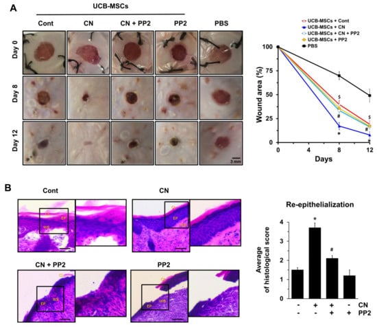 All experimental procedures were approved by Daegu Hanny University, and all animal procedures were performed following the National Institutes of Health Guidelines for the Humane Treatment of Animals, with approval from the Institutional Animal Care and Use Committee of Daegu Hanny University (DHU-2020-001) at 10 February 2020. Eight-week-old male ICR mice were used. All surgeries were performed under anesthesia using a 2:1 mixture of Zoletil™ (20 mg/kg, Virbac Laboratories, Carros, France) and Xylazine HCl (10 mg/kg, Rompun®, Bayer, Germany) and all efforts were made to minimize suffering. Mouse skin wounding and stem-cell implantation were performed as described previously [28,29]. Briefly, after shaving the backs and scrubbing with an organic iodine solution, a circular full-thickness wound was surgically created using a 6-mm-diameter sterile biopsy punch. UCB-MSCs were pre-treated with 100 pg/mL CN for 24 h prior to skin transplantation. To determine the functional role of UCB-MSCs pre-treated with CN, experimental animals were divided into five groups: Vehicle groups that received a PBS alone (group 1, n = 8), UCB-MSCs transplantation groups that were given UCB-MSCs treated either with PBS as a control (group 2, n = 8) or with 100 pg/mL of CN (group 3, n = 8); and UCB-MSCs/c-Src inhibitor (PP2) transplantation groups that were given UCB-MSCs pretreated with a Src inhibitor, PP2 (10 µM), prior to exposure to 100 pg/mL CN (group 4, n = 8) or a PBS (group 5, n = 8) for 24 h. We injected 1 × 106 UCB-MSCs in 70 µL PBS containing 50% growth-factor–reduced Matrigel (BD Biosciences, NJ, USA) into the dermis at two sites around the wound and topically applied 0.3 × 106 UCB-MSCs in 30 µL PBS containing 50% Matrigel onto the wound bed on day 0 and day 8. Subsequently, the wounds were dressed with Tegaderm (3M, London, ON, Canada). Images of the wounds were taken on days 0, 8 and 12 with a digital camera system (D50, Nikon, Tokyo, Japan) at the same camera/subject distance (30 cm). The wound closure sizes were determined by wound resealing measurements from the images captured at the wounded sites. The wound areas were measured planimetrically using the free-hand tool in the Image J software (NIH, Bethesda, MD, USA). Percent wound closure values were calculated as the difference in the wound size on a particular day compared to day 0 (time of wounding)/initial wound size. On day 12, the wound tissues were embedded in O.C.T. compound (Sakura Finetek, Torrance, CA, USA) and stored at −70 °C, after which the samples were cut into 6-µm-thick frozen sections using a cryosectioning machine and mounted on SuperFrost Plus slides (Thermo Fisher Scientific, Rockford, IL, USA) for hematoxylin and eosin (H&E) staining. The quantitative aspects of the score were evaluated according to the percentage of the tissue presenting the specific qualitative features of re-epithelialization during the process of skin wound healing according to a method published by Rajabi et al. [30] (Table 1) and validated previously through similar experimental models [31,32], after which the averages of the sums of the scores for each mouse were calculated. A histological analysis was carried out by four independent observers who were unaware of the treatment. On the other hand, we have further checked the endotoxin contamination in CN and UCB-MSCs treated with CN by using endotoxin quantitation kit (Pierce™ LAL Chromogenic Endotoxin Quantitation Kit, Thermo). The level of endotoxin was 0.014 ± 0.005 and 0.018 ± 0.001 EU/mL at 100 pg/mL of CN and 10 µg/mL of UCB-MSCs treated with 100 pg/mL of CN, respectively. This means that CN and UCB-MSCs primed by CN are safety and purified products containing very low level of endotoxin (less than 0.02 EU/mL) and suitable for our experiments in this study.