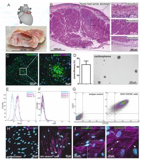 Isolation and characterization of adult human cardiac stem cells (hCSCs). (A) Human heart auricles were removed during routine heart surgery. (B) Heart auricle tissue consists of the three main layers: endocardium, myocardium and epicardium. (C) Nestin+ and S100+ cells can be found in the myocardium of the human heart auricle. (D) Isolated cells spontaneously form cardiospheres and possess the ability for self-renewal with a clonal efficiency of 22.7%. (E) Cultured cells express the cardiac stem cell marker Sca1. (F) Cultured cells do not express the stem cell marker cKit. (G) Double staining shows that cultured cells coexpress the cardiac stem cell markers CD31 and CD105. (H) After cardiac differentiation with biochemical cues, 94% of cells express the cardiomyocyte protein α-actinin. (I) After differentiation with biochemical cues, the gap junction protein Connexin43 is expressed at the surface of α-actinin+ cells, indicated by arrowheads.