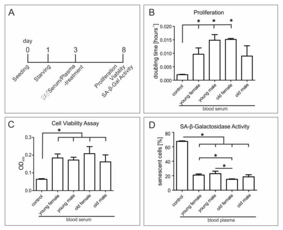 Blood plasma samples were collected from routine blood donation service from healthy individual donors. For further comparisons, plasma donors older than 60 years were declared “old,” and donors younger than 20 years were declared “young”. For the isolation of serum from fresh frozen plasma (FFP), 20% CaCl2 was added in a ratio of 1:50 and incubated at 4 °C overnight. After centrifugation at 1920 RCF for 20 min, blood serum was harvested from the supernatant. In all assays, blood plasma or serum from three different donors was used as biological replicates within the treatment groups.