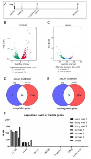 RNAseq showed increased differential gene expression in an age-dependent manner. (A) hCSCs where exposed to blood serum and blood plasma from old (>60 years) and young (<20 years) male donors or starvation medium followed by RNAseq. (B) Volcano plot of differential expressed genes in hCSCs treated with young serum vs. control. (C) Volcano plot of differential expressed genes in hCSCs treated with old serum vs. control. Red: upregulated; green: downregulated genes. A detailed list is provided in Supplementary Table S1. (D) Venn diagram of upregulated genes in the old and young treatment groups. (E) Venn diagram of downregulated genes in the old and young treatment groups. (F) Gene expression levels (in fragments per kilobase million, FPKM) of selected marker genes for cardiac stem cells (CD105, Nestin) and genes that are upregulated during cardiac differentiation (Nkx-2.5, MEF2C, TroponinT, βMHC, cardiac actin). Expressions of CD105 and Nestin are not affected by serum treatment, and cardiac differentiation genes were not expressed either in the control or in the serum-treated samples.