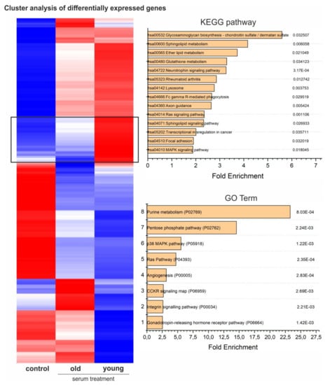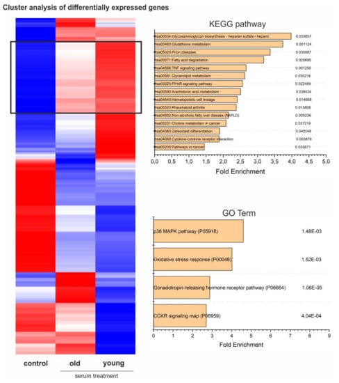 Analysis of GO Term enrichment showed beneficial effects on cell cycle and proliferation which was underlined by enrichment of the p38 MAPK pathway (P05918) as the most enriched GO-Term in samples treated with either young or old blood serum (Figure 6). In addition, the term oxidative stress response (P00046) followed as the second most enriched. Interestingly, the application of a KEGG-pathway analysis within this cluster also demonstrated amongst others, the upregulation of the KEGG-pathway glutathione metabolism (hsa00480), further highlighting a possible antioxidative effect of blood serum on hCSCs. In addition, analysis of the genes upregulated only in cells treated with young serum showed GO terms associated with DNA and protein-synthesis-like purine metabolism (P02769) or the pentose phosphate pathway (P02762), leading to enhanced proliferation (Figure 5). The p38 MAPK pathway (P05918) was also in this cluster among the significantly enriched GO terms with a 5.5-fold enrichment and in the KEGG pathways (hsa04010) (Figure 6). Interestingly, the application of GO terms and KEGG-pathway enrichment on a cluster of genes downregulated in cells treated with young serum but upregulated in cells treated with old serum led to the significant enrichment of the GO terms integrin signaling pathway (P00034) and cadherin signaling pathway (P00012) and the KEGG-pathways ECM-receptor interaction (hsa04512), adherens junction (hsa04520), focal adhesion (hsa04510) and tight junction (hsa04530), possibly indicating degenerated exchange with the extracellular matrix (ECM) or neighboring cells or altered intercellular communication—one of the nine hallmarks of aging that were defined in 2013 [] (Figure S4). Moreover, within this cluster we found the KEGG-pathways arrythmogenic right ventricular cardiomyopathy (hsa05412), hypertrophic cardiomyopathy (hsa05410) and dilated cardiomyopathy (hsa05414), which may indicate an age-dependent protective effect of young blood serum on hCSCs (Figure S4). In summary, GO enrichment analysis revealed the upregulation of various pathways, with p38-MAPK pathway being the most enriched GO term in genes that are highly upregulated after treatment with young serum and not regulated in the old serum group (see Figure 6). Further, p38-MAPK is also in third position (after general metabolism-associated GO terms) of the most enriched GO terms in genes that are highly upregulated after treatment with young serum and downregulated after treatment with old serum (Figure 5).
