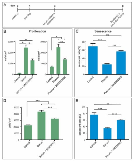 In vitro inhibition of p38-MAPK reversed the beneficial effect of blood plasma on proliferation and survival of hCSCs. (A) hCSCs where exposed to blood plasma and serum and p38 inhibitors BMS-582949 and SB239063. (B) Inhibition of p38 with BMS582949 led to significantly decreased proliferation compared to plasma and serum treatment alone. (C) Inhibition of p38 with BMS582949 led to significantly elevated SA-β-Gal activity compared to plasma treatment alone. (D) Inhibition of p38 with SB239063 led to significantly decreased proliferation compared to serum treatment alone. (E) Inhibition of p38 with SB239063 led to significantly elevated SA- β-Gal activity compared to serum treatment alone. Mann-Whitney two-tailed, * p < 0.05; ** p < 0.005; *** p < 0.0005; **** p < 0.0001 was considered significant, not significant (n.s.) p > 0.05.