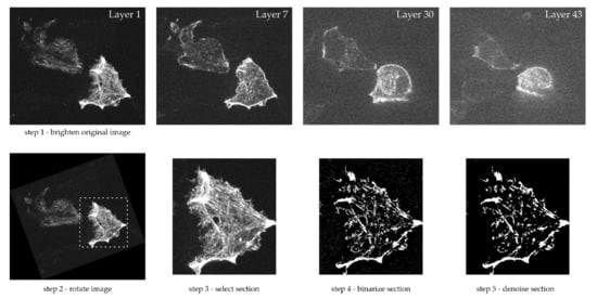 A MATLAB™ script was written to process these images (compare Figure 1, bottom). Since the cells on the images were not always centered and filled the image completely, the appropriate section was selected first. A rectangular format was possible, whereby a rotation of the section within the image plane was possible. Depending on the quality of the input image, the image optimization “imadjust” in MATLAB™ was used. This reassigns the intensity values, and thus, increases the contrast of the image. The image was then binarized using thresholding. We examined whether each pixel was brighter or darker than the threshold value, whereby the limit value of 50% of the maximum brightness was used. The subsequent denoising was achieved using a two-dimensional median filter. This also took into account the fact that the images not only showed the respective layer, but also partly less sharply the adjacent areas in depth direction. Thus, all actin structures are clearly visible in white, while all other cell contents are blackened. For further interpretation, the fact that the resolution in the z-direction was different from that in x- and y-direction was taken into account. While between each image, i.e., each individual plane, a distance of about 200–250 nm was present, the in-plane resolution amounted to between 20 and 60 nm per pixel.
