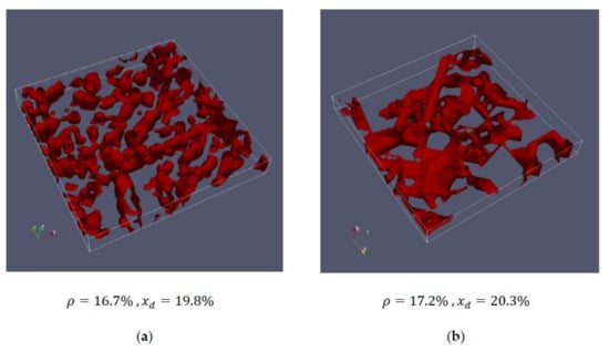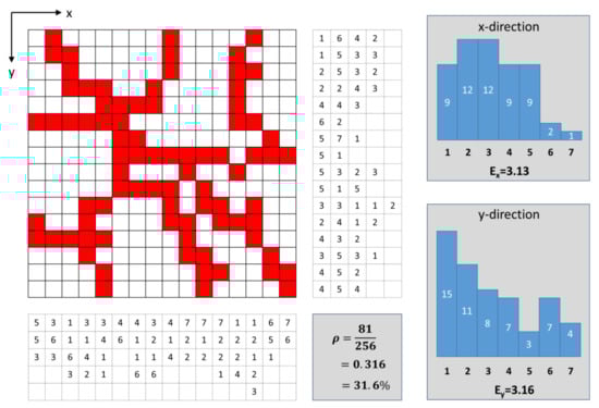 From this distribution and the expectation value, it can now be determined whether the network has narrow meshes (then the value would be small) or wide meshes (large value). An anisotropy would also be recognizable through different values for the different directions. In the case of a three-dimensional network, it is possible to proceed accordingly, resulting in three histograms and three mean values. The objective characterization of the networks used in this paper is, therefore, based on the characteristic values “density” and “mean values of the chord lengths”, as well as the histograms of the chord length distributions. The chord lengths are usually values that are unit-related, but for many purposes, they are also related to the total size of the domain. This is also the case here, where the chord lengths are given as the number of connected elements in the respective direction, relative to the total number of elements in that direction.