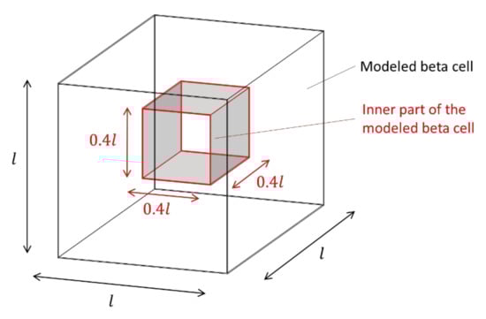 The simulation area should represent an entire beta cell in three dimensions. In this first step, the phenomenology and feasibility of the presented concept is the focus. Therefore, the beta cell is not described with a real measured shape, but as a cube whose edge lengths of 10 µm correspond approximately to the size of a real beta cell. In order to be able to map the essential properties of the cell associated with the granules in this first approximation step, the cube is discretized into 70 × 70 × 70 equidistant elements. The size of an element thus represents, in reality, a volume of 143 × 143 × 143 nm, which corresponds approximately to the size of an insulin granule, allowing the later implementation to occur effectively. The elements at the boundary of the cube indicate the cell membrane.