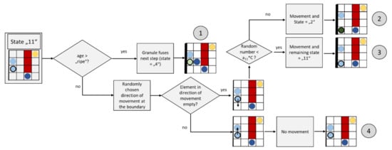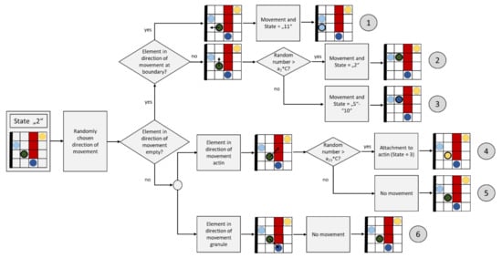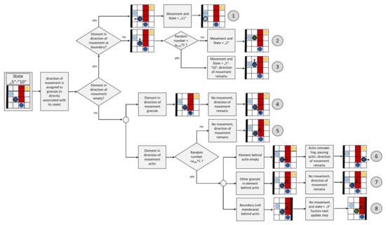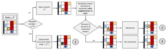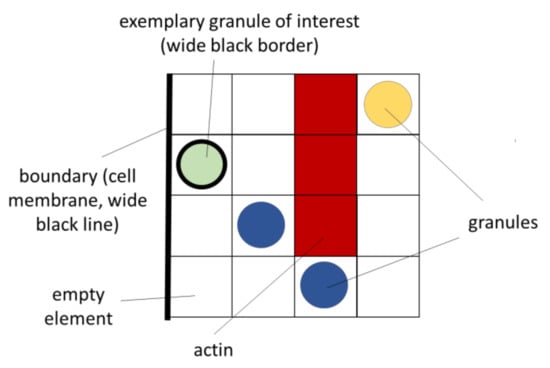 Notably, the applicability of CA to different kinds of transport and growth processes plays a very important role for this paper. In order to describe the granule movement that is presented in Chapter 2, the sources listed above serve as the basis for the rules used. In addition, the literature has already provided the first models to describe the granule movement at cell membranes (but mostly not in beta cells) under the influence of actin [,,]. In these sources, the movement trajectories of granules were identified with the help of microscope images, and reproduced on the basis of random walk models. The probabilities used in these models correlate with the corresponding diffusion coefficients; thus, they also take into account the influence of actin. From a system theoretical or mathematical point of view, a random walk model is a special case of a Cellular Automaton, which is used in a modified and extended form in this paper.