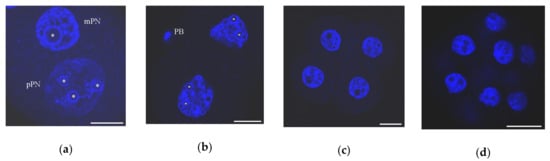 There are some species-specific features of the deposition of post-translational histone modifications in mammalian zygotes. A clear asymmetry between the pPN and mPN in relation to the content of H3K27me3 was described in the pig [,,] and cow [,]. The H3K9me3 pattern was also asymmetric between the pPN and mPN of horse zygotes []. At the same time, the distribution of H3K9me3 in bovine zygotes was rather variable and cannot be considered reliable for determining the parental origin of the PN [].