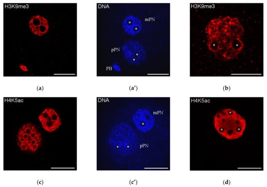 Distribution of H3K9me3 and H4K5ac—the representative marks of “repressed” and “active” chromatin, respectively—in mouse zygotes (a,c; a’,c’, DAPI staining) and two-cell embryos (b,d); both marks are detected in the heterochromatin rings around nucleolus precursor bodies (some marked with asterisks); mPN, maternal pronucleus; pPN, paternal pronucleus; PB, polar body. Note that H3K9me3 is revealed in mPN but not in pPN. Scale bars represent 20 μm.