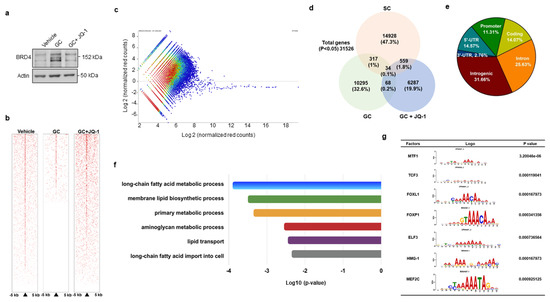 ChIP-seq analyses of H3K9ac-binding genes in vehicle-, glucocorticoid-, and JQ-1-treated mesenchymal stem cells. JQ-1 treatment attenuated glucocorticoid-induced BRD4 levels (a). Heatmaps of ChIP-seq analyses showing H3K9ac occupancy in DNA within 5 kb upstream and downstream of transcriptional start site (b). Scatter plots of H3K9ac ChIP-seq signals distribution in Veh, GC, GC + JQ-1 groups (c). Venn diagram displaying the overlap of H3K9ac-enriched genes (d). Relative distribution of H3K9ac occupancy across genomic regions (e). Gene set enrichment analysis of H3K9ac marks showed significant changes in fatty acid and lipid metabolism in the Vehicle, GC, and GC + JQ-1 groups (f). The H3K9ac-enriched motif of transcription factors identified in the vehicle, GC, and GC + JQ-1 groups (g). ChIP-seq of H3K9ac-enriched epigenome was performed using Illumina HiSeq4000 system. Experiments were performed three times. Veh: vehicle; GC: glucocorticoid.