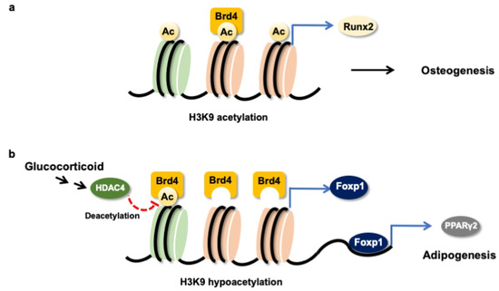 Schematic drawing of BRD4 control dysregulation of osteogenic differentiation and adipocyte formation of bone-marrow osteoprogenitor cells. BRD4 and H3K9ac are required in the Runx2 transcription in the osteogenic differentiation of mesenchymal stem cells (a). Glucocorticoid increases HDAC4 and BRD4 actions to Foxp1 transcription, which upregulates PPARγ2 signaling to drive mesenchymal stem cells into adipocytes (b).