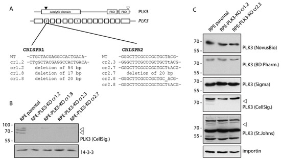 Generation of RPE-PLK3 knock-out cells. (A) Schematic diagram of CRISPR/Cas9-mediated targeting of human PLK3 and of domain organization of PLK3 protein. Black arrowhead indicates the position of the critical ATP-binding Lysine 91 in the catalytic domain. Empty arrowhead indicates the position of the epitope of the PLK3 antibody from Cell Signaling. Fragments of the genomic DNA from selected clones were PCR amplified and analyzed by sequencing. (B) Parental RPE and selected clones of RPE-PLK3-KO cells were analyzed by immunoblotting using rabbit monoclonal PLK3 antibody (Cell Signalling). (C) Parental RPE and two independent clones of RP-PLK3-KO cells were probed with indicated antibodies. The position of PLK3 is indicated by an arrowhead. Please note the missing band corresponding to PLK3 in staining with antibody from St Johns laboratory and high level of cross-reactivity with other proteins.