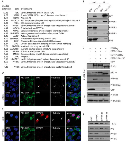 Next we aimed to map the interaction between PLK3 and PP6. We found that the EGFP-PLK3-∆PBD mutant lacking the PBD domain showed impaired interaction with PP6 (Figure 5C). Similarly, H590A-K592M mutation of the predicted interaction site in the PBD domain also impaired interaction with PP6, suggesting that the PBD domain is needed for mediating the binding with the PP6 holoenzyme (Figure 5C) [2]. Interestingly, PP6 subunits were recently identified in a complex with PLK1, suggesting that interaction with PP6 might be conserved also for other polo-like kinase members [42]. Finally, we aimed to compare the subcellular distribution of PLK3 and PP6 complex. Immunofluorescence microscopy revealed colocalization of EGFP-PLK3 with endogenous PPP6C at the centrosome (Figure 5D,F). In addition, antibody against PPP6R3 showed a strong nuclear staining but partially also colocalized with γ-tubulin and EGFP-PLK3 at the centrosome (Figure 5E,F).